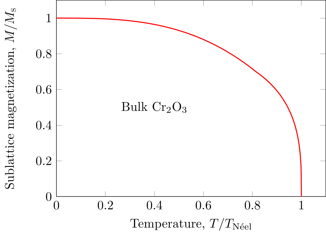 We work a lot with antiferromagnets, with a special focus on α-Cr2O3 (chromia). There, DFT and experimental estimates agree with the sublattice magnetization at 0K to be \( M_S \approx 530 \) kA/m (note that it includes two magnetically equivalent Cr ions within the four-Cr unit cell!) (Samuelsen70), (Pylypovskyi24). The bulk critical temperature of transition to the paramagnetic state is 308K. And within this range, there is a nice fit of the experimental measurements given by the analytical expression (Hoser12):